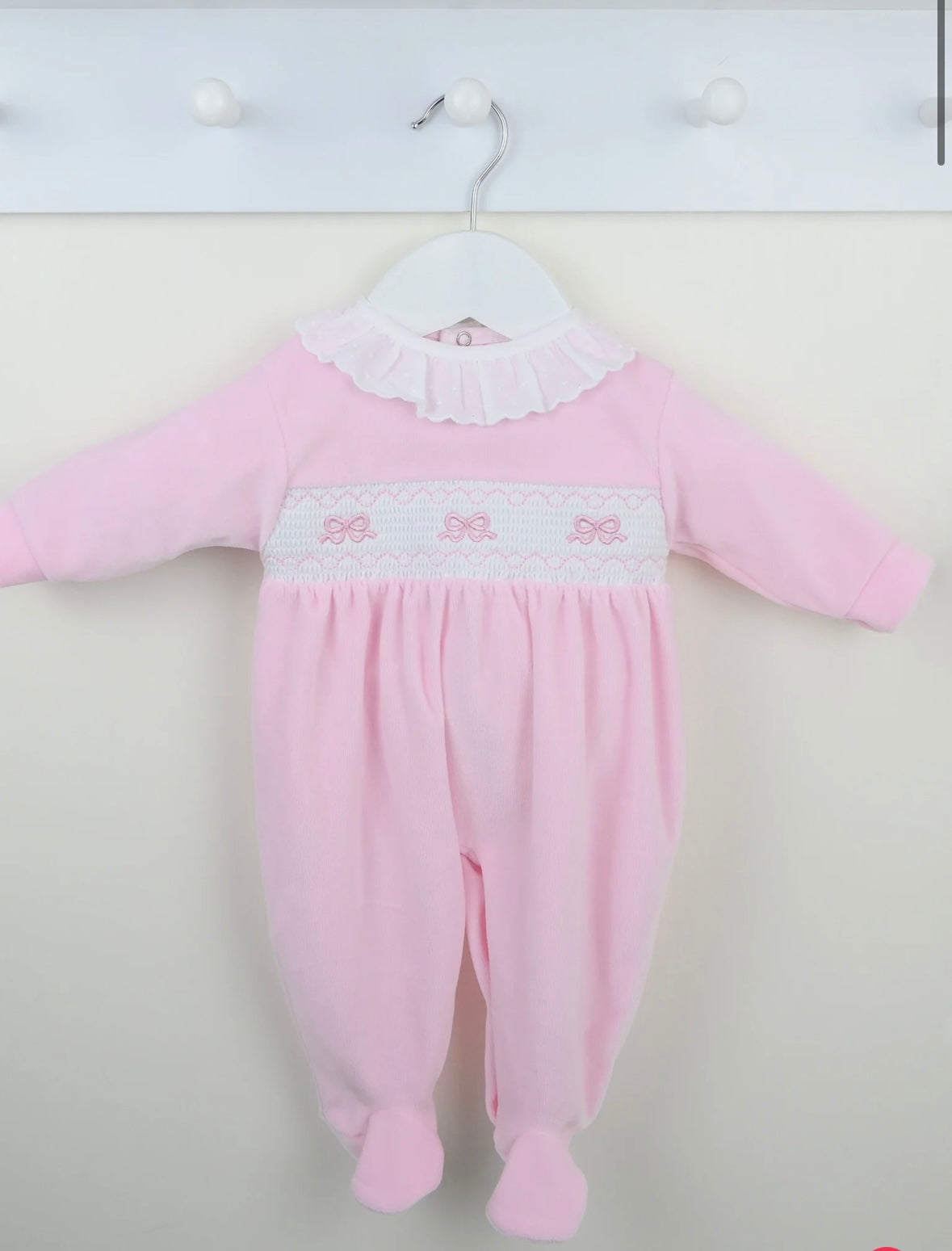 A beautifully soft pastel pink velour with a pretty smocked panel featuring the cutest little bow embroideries along with a chic white lace collar. Handy press studs down the back and around the legs. Made by the lovely Pex.