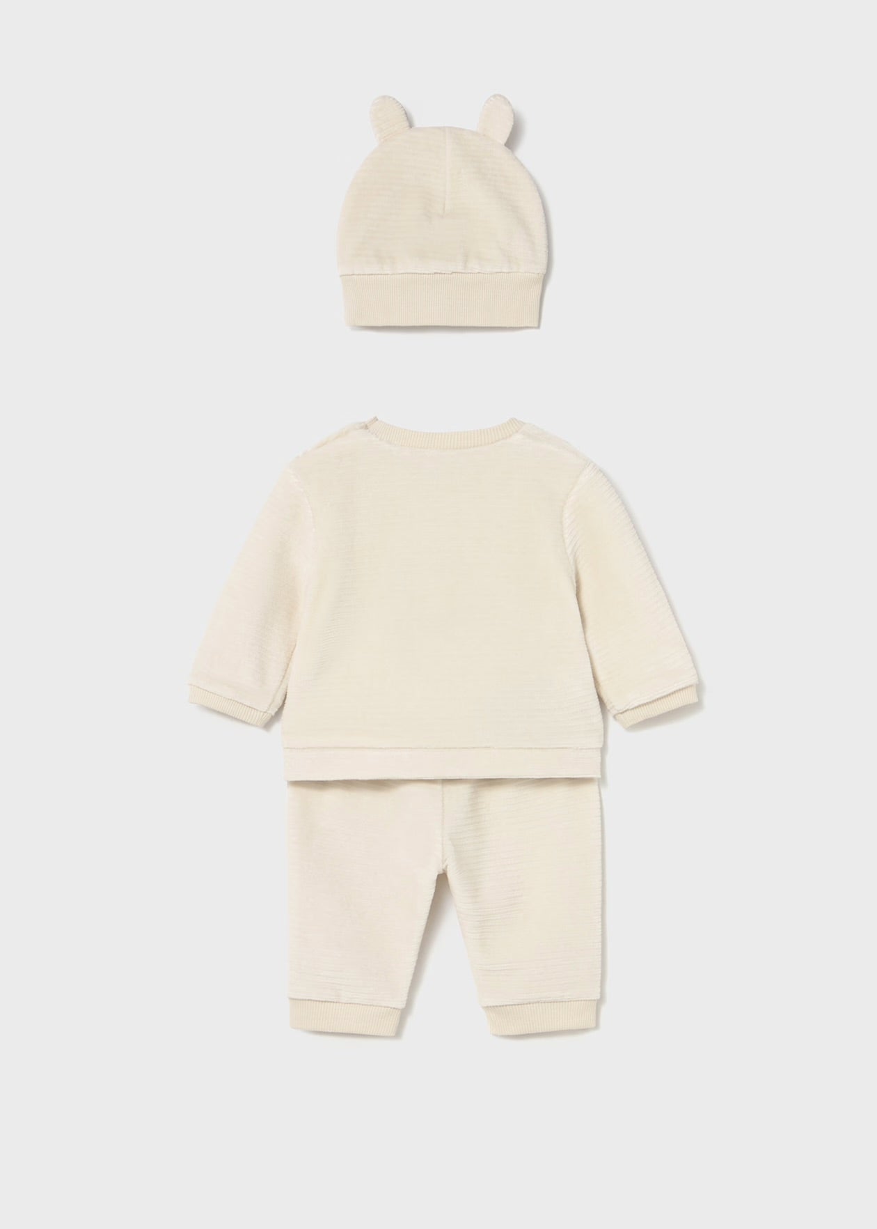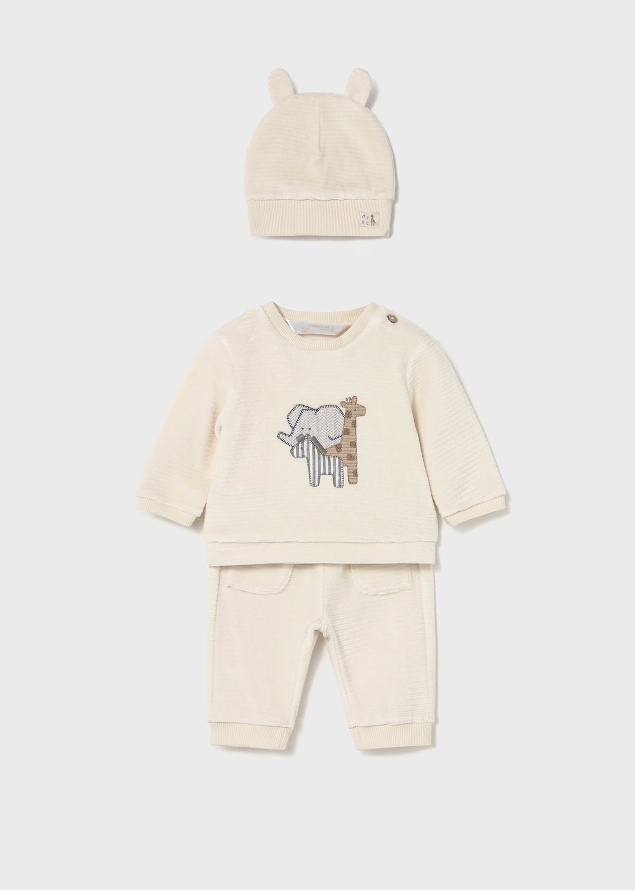 Introducing our Mayoral Cream Safari Corduroy Set! Perfect for your little boy, this set features a playful safari design with an elephant, zebra, and giraffe. Made from soft, knitted corduroy, it's both comfortable and stylish. Includes top, trousers, and hat.
