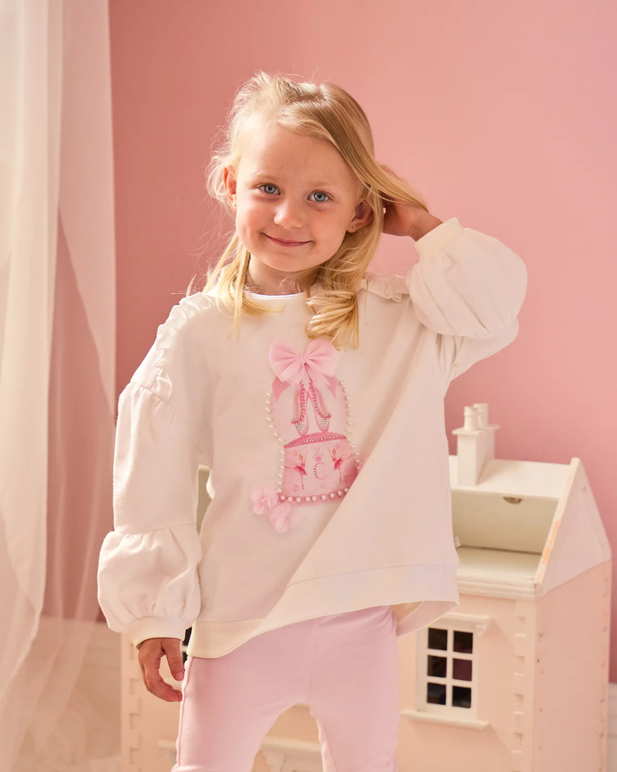 Stay cool and chic in the caramelo snow Globe Legging Set. The heavyweight ivory top features a playful pink crown design with pearl embellishments. The pink leggings have frilled cuffs and are perfect for everyday wear. Stay comfortable and stylish on any occasion with this beautiful set.