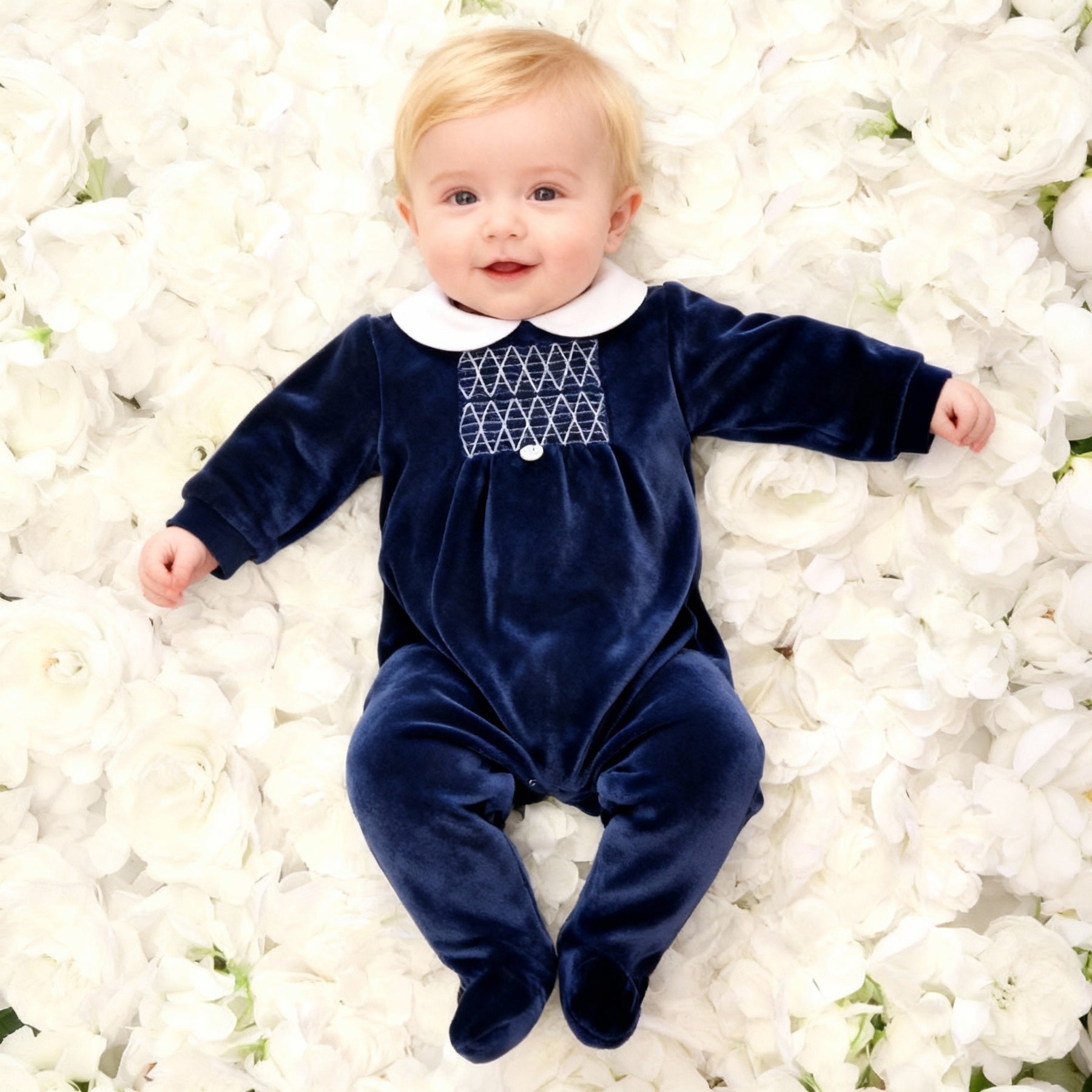 This Deolinda Babygrow is the perfect choice for your little boy. Made of soft and cosy navy blue velour, it's both comfortable and stylish. The smocking detail adds a touch of elegance to this beautiful navy blue outfit. Welcome your baby home in style with this adorable Babygrow!