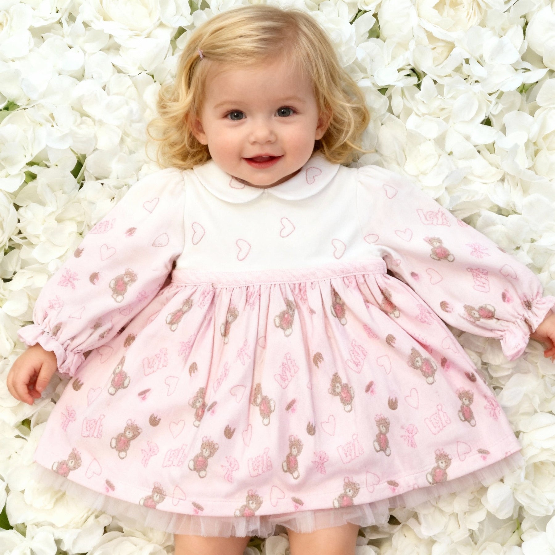 Get ready for cuteness overload with the Deolinda Pink Love Teddy Dress! This adorable dress is adorned with pink hearts and teddy bears, making it the perfect choice for your little girl. Let her showcase her love for all things cute and cuddly with this playful and lovable dress.