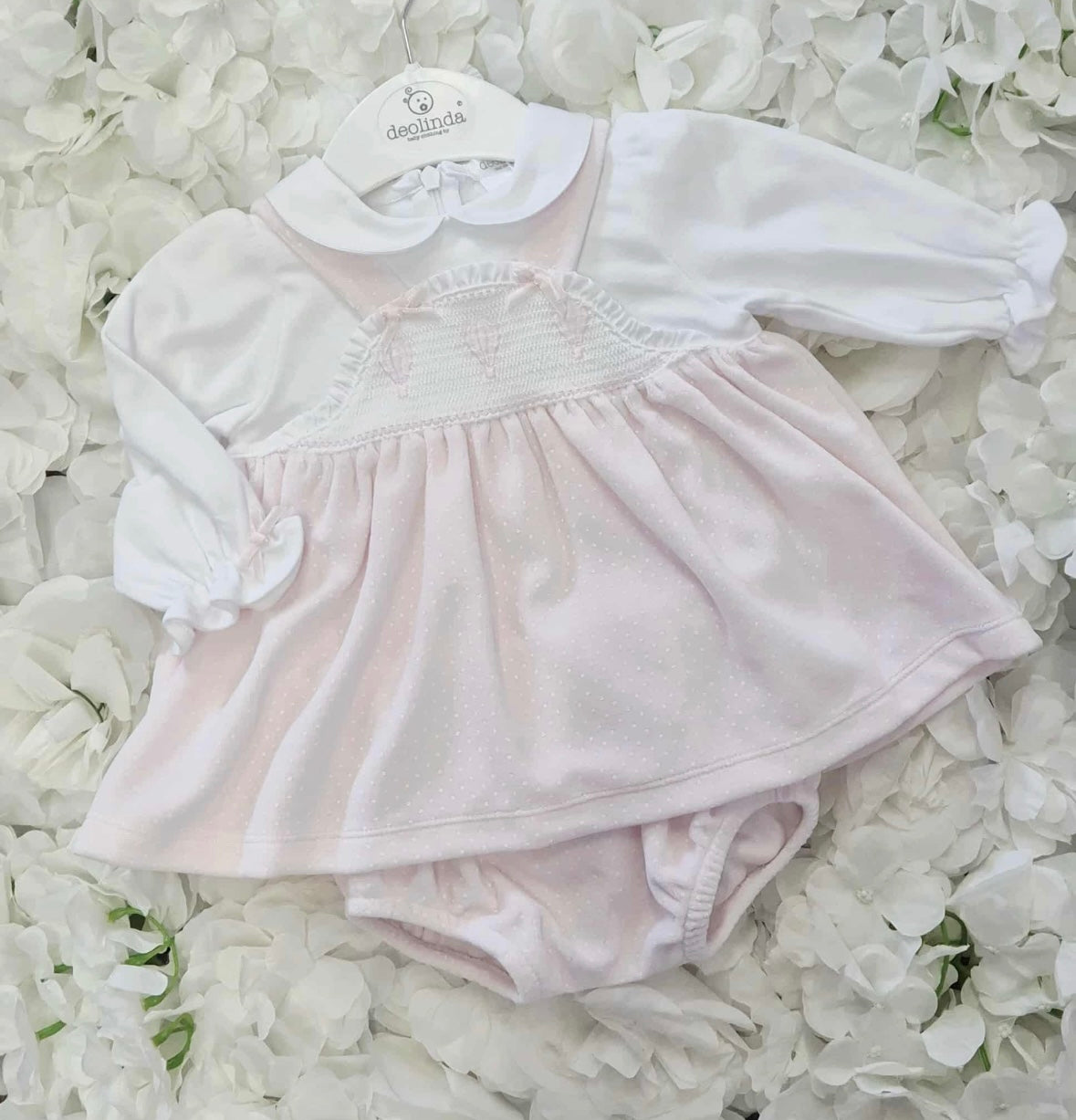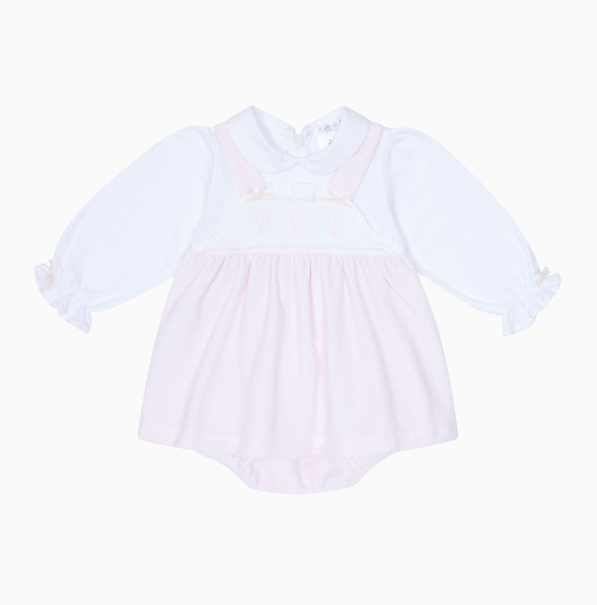 Introducing the Deolinda Pink Hot Air Balloon Dress Set - a beautiful and fun outfit for your little girl! This set includes a lovely pink and white dress with matching pants, adorned with adorable hot air balloon embroidery.