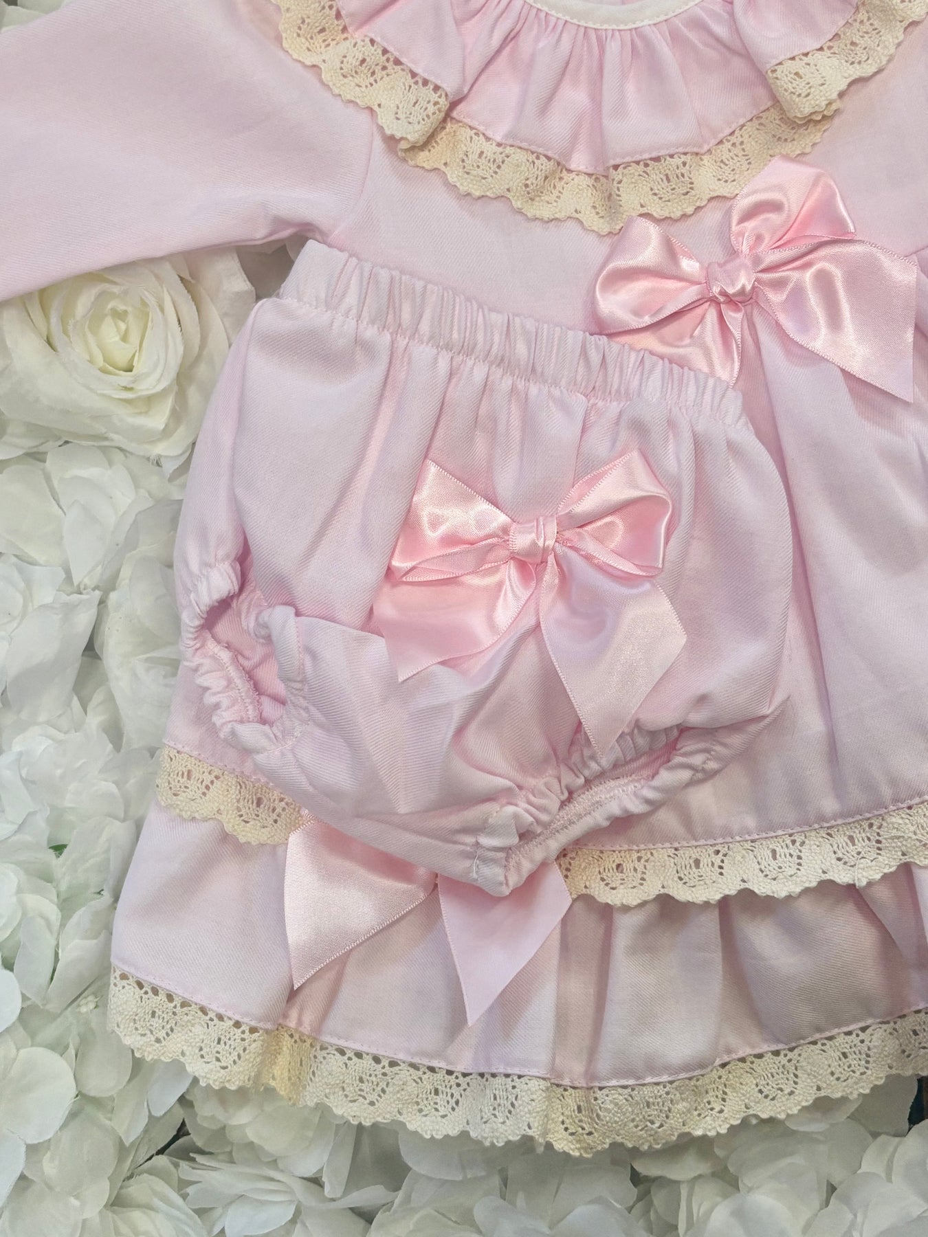 Introducing the Pink Bow Frill Dress! This beautiful girls' dress features a charming bow and frill style in a lovely pink and cream color. Plus, it includes nappy cover pants for added convenience. Dress your little one in style and comfort with this must-have dress!