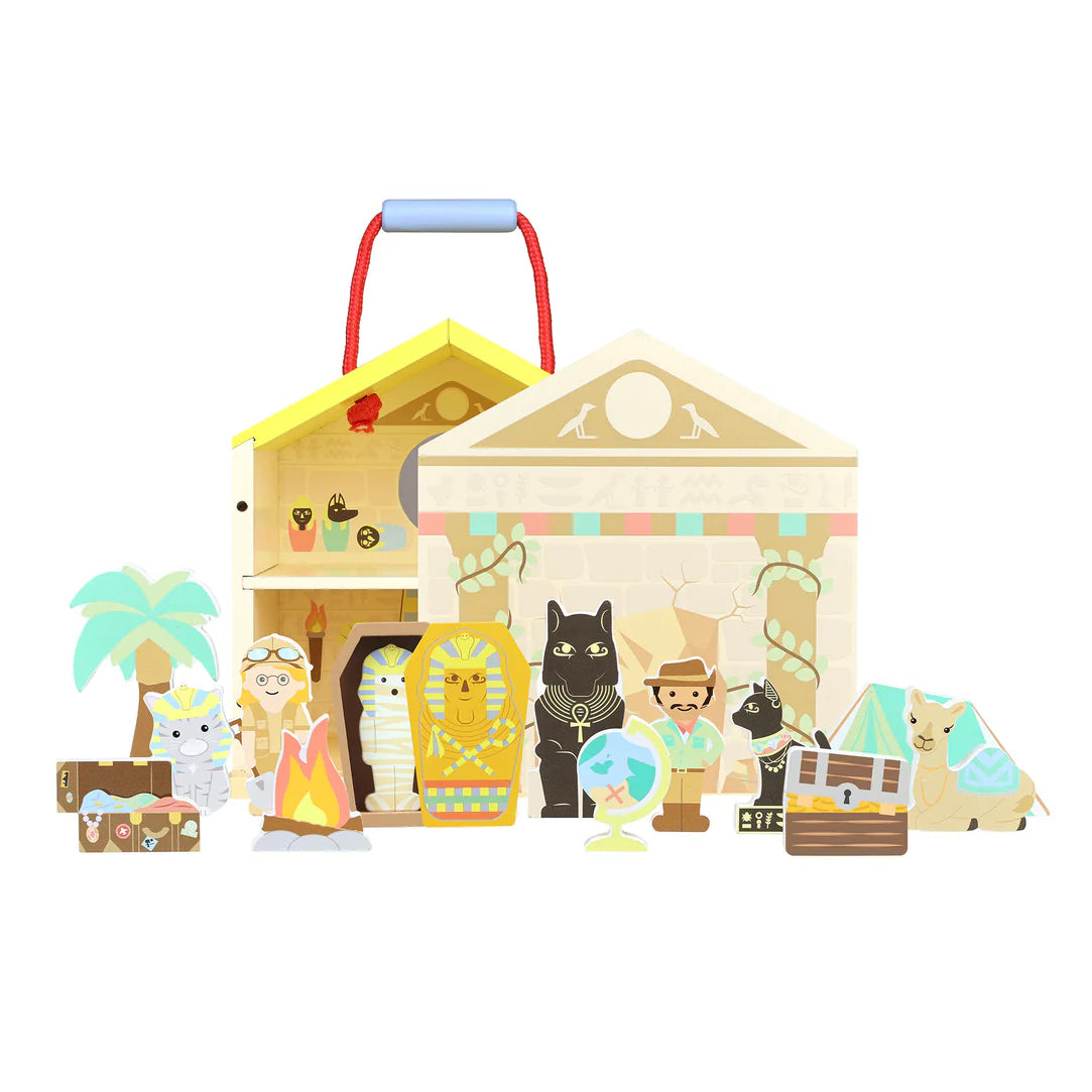 This fun and interactive playset features all sorts of exciting pieces, such as the two adventurers, their trusty camel, a spooky mummy and all sorts of fun treasures! Remove the magnetic front panel to reveal a vast desert oasis, complete with buried treasure and curious crocodile! Unfold the paper map and search for the buried treasure, it belongs in a museum! Children will love using the compass and map to take their adventurer pals on a trek across the desert, eager to discover ancient secrets hidden away.