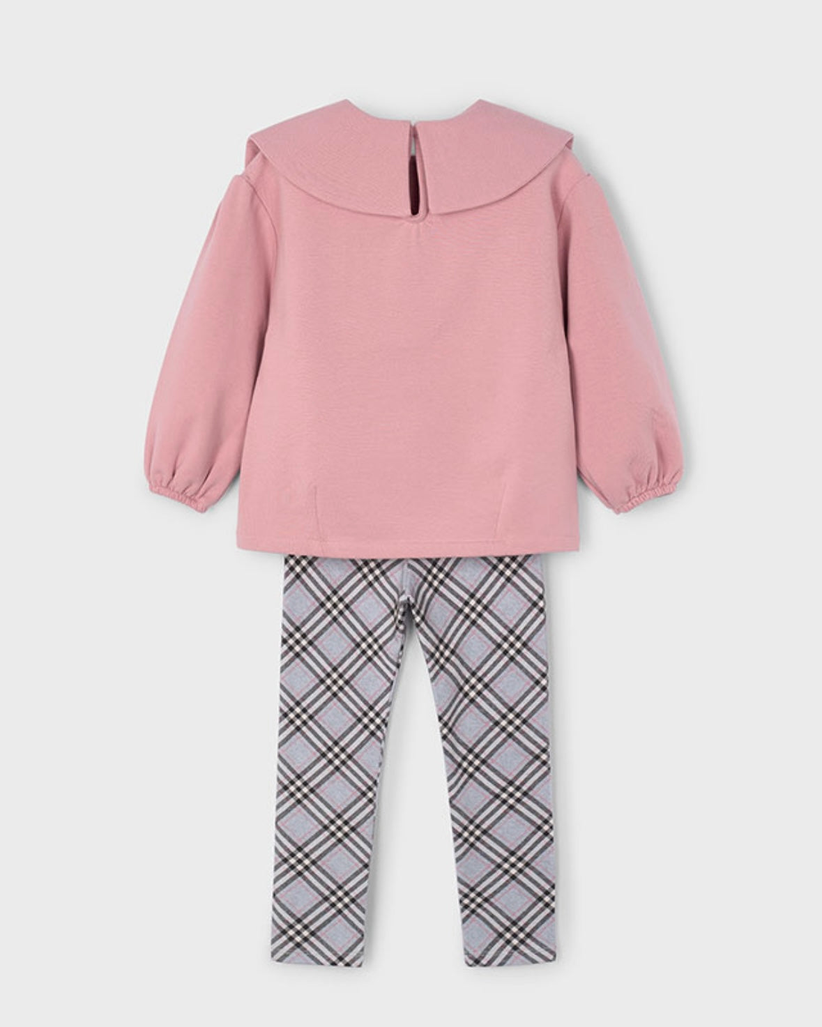 The Mayoral Tartan Leggings Set is perfect for your little girl. Featuring a beautiful rose pink bow style collar top and matching grey tartan leggings, this set is both stylish and comfortable.