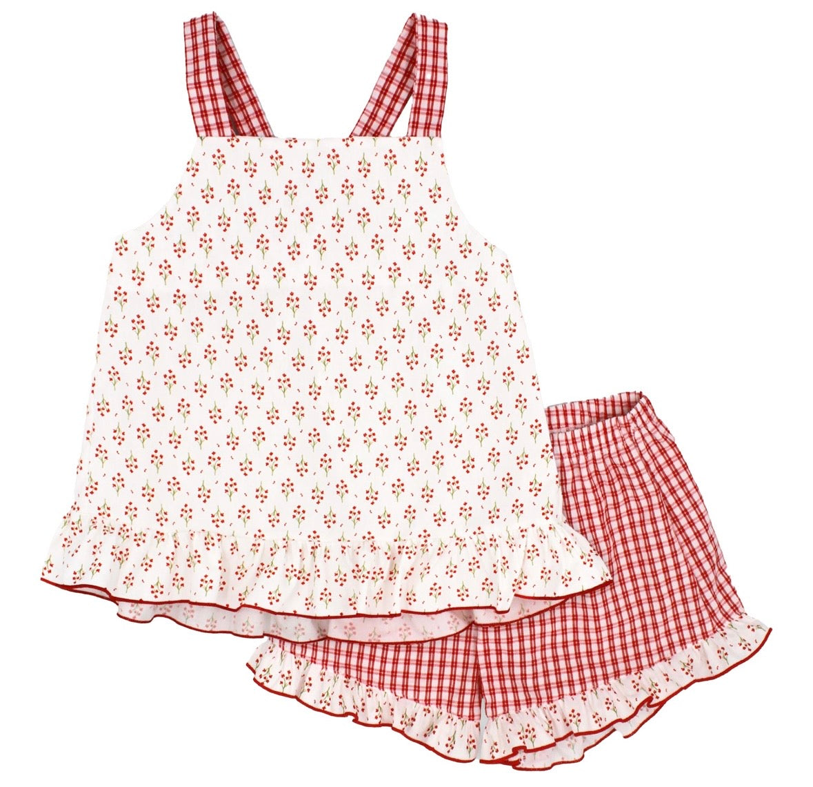 The Rapife Red Floral Short Set is perfect for your little girl. The charming red floral design adds a touch of sweetness, while the stunning bow back offers a playful flair. This set combines comfort and style, making it a delightful choice for any occasion.
