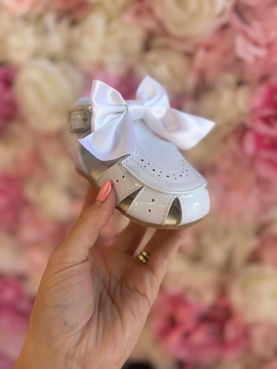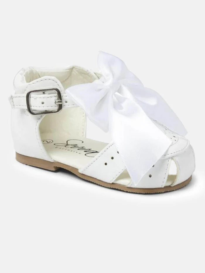These beautiful white patent sandals by Sevva are perfect for little girls with their cute bow detailing and buckle fastening.