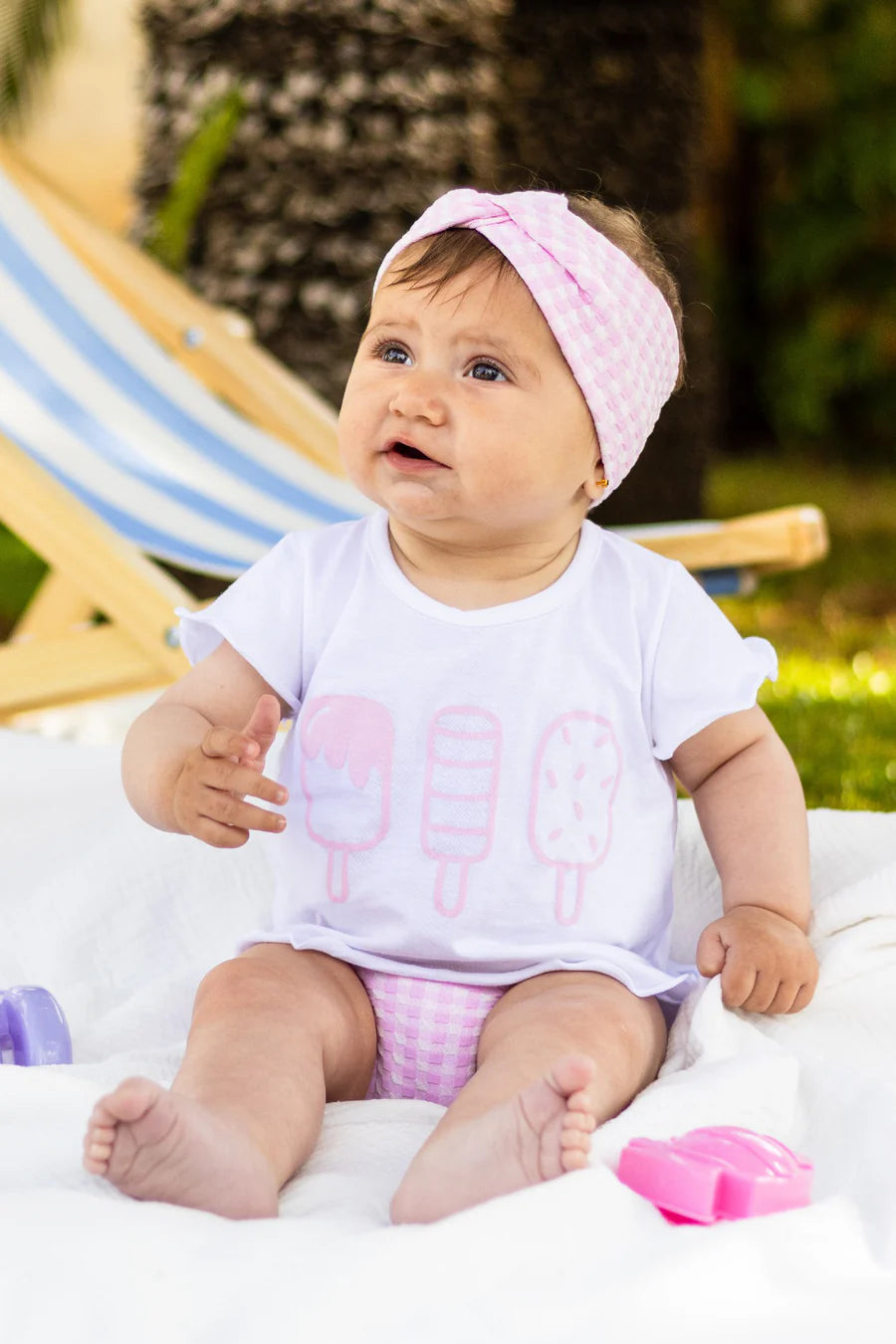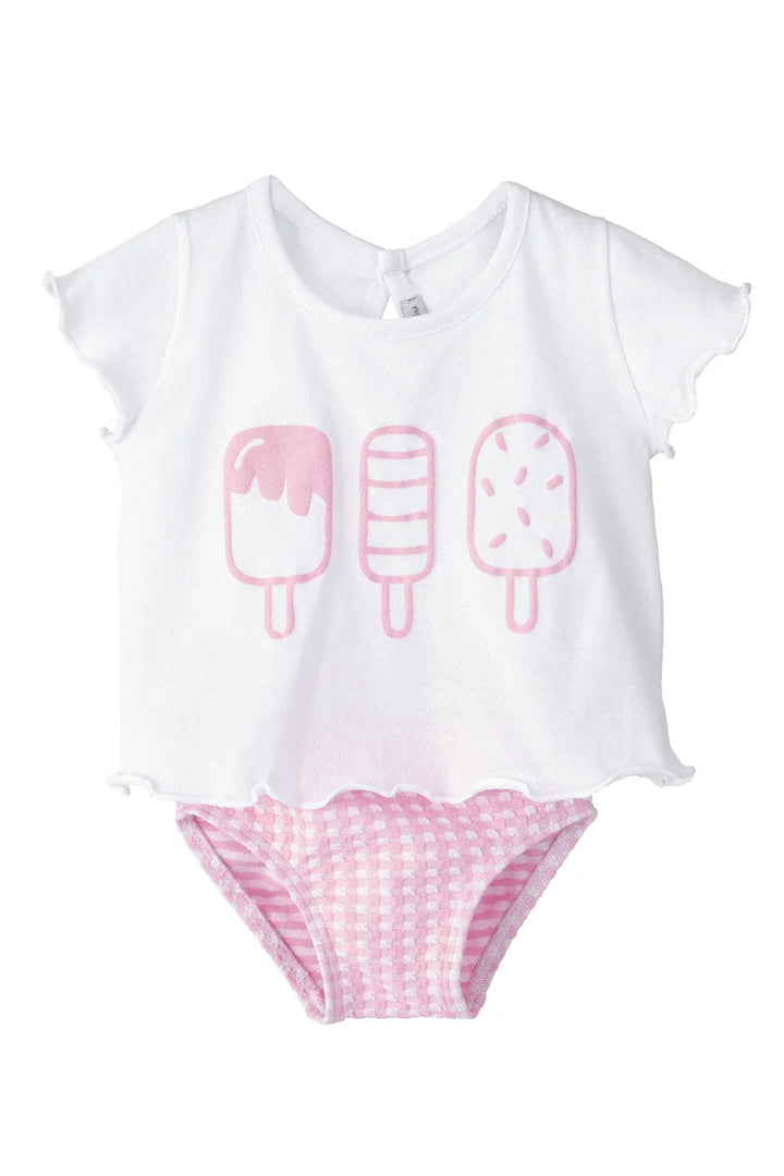 Get your little beach lover ready for summer with this sweet two-piece set from Calamaro! The lightweight white t-shirt features a playful pink ice lolly print. Paired with pink and white gingham seersucker bikini bottoms, this set is perfect for sunny days by the pool!